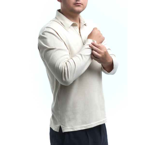 Beige men's long-sleeved polo 55% hemp 45% cotton